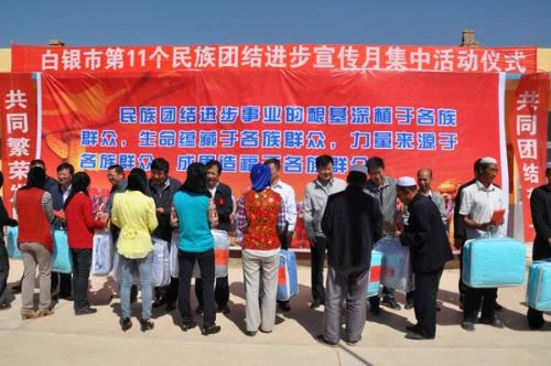 活动仪式上,市委统战部(市民族宗教事务委员会)为景泰县红水镇靖安回族村帮扶发展资金20万元,市民政局向困难群众发放慰问金5000元、棉被10床,市教育局为靖安回族小学捐赠价值3万多元电子显示屏一个,市残联向残疾人发放轮椅10辆;彦学宾馆经理蒲彦学为靖安村回族小学学生捐赠书包80个,市、县民族团结进步宣传月活动成员单位承诺实施帮扶项目6个、协议项目资金200多万元,并现场发放农业科技、医疗卫生等方面书籍800多本。